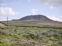 a hill with a telephone tower in the background and a road running between it on a grassy plain