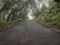 A gloomy day on the roads of Tenerife, Spain. The grey sky and fog create a mysterious atmosphere. The straight road cuts through the lush green landscape and forest, providing a unique POV of the natural environment.