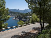 This image captures a scenic view of an empty road winding down the side of a body of water near the mountains and a village in Mallorca, Spain. The coastal landscape showcases the clear sky and the serene waters of the ocean. In the distance, a pier and a harbor can be seen, adding to the natural beauty of the scene. The road is lined by Armco barriers, providing safety for drivers. This photo represents the picturesque nature and stunning landscapes that can be found in the Balearic Islands of Europe.