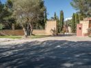A fish-eye lens captures the modern architecture of a residential building in rural Mallorca, Spain. The road, lined with asphalt, leads to the driveway. The clear sky showcases the beauty of the European landscape.