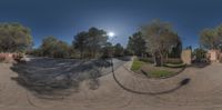 fish eye lens of the road near a building in rural countryside area, looking at a driveway