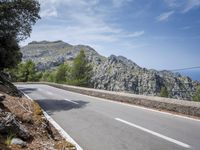 This is an image of a coastal road in Spain. The asphalt road winds through highland terrain, with mountains in the background. On one side of the road, there is a rock wall protecting against the ocean. The landscape is filled with lush vegetation and trees. The clear sky above is dotted with contrails, indicating overhead air traffic. The photo provides an overview of the European scenery, showcasing the natural beauty and infrastructure of the Balearic Islands. It captures the mode of transport, with automobiles traveling along the highway. This picture represents a sunny day in Spain's coastal wilderness.