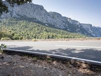 This is an image of a scenic road in Spain, surrounded by mountains and overlooking the coast. The asphalt road winds through the mountainous landscape, lined with trees and vegetation. The clear sky above enhances the view, showcasing the beauty of the Balearic Islands. The road features lanes and curves, with an Armco barrier for safety. This photo captures the natural wilderness of Spain, with its mountain passes and stunning views. Explore Europe's stunning scenery through this captivating image of the Spanish countryside.