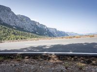 Scenic coastal road in Spain, winding through scenic Balearic Islands landscape. Clear skies and breathtaking mountain views make it perfect for a road trip. The asphalt road is bordered by a protective Armco barrier.