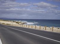 A scenic coastal road in Fuerteventura, Spain, surrounded by the beauty of nature. The azure ocean and clear blue sky create a breathtaking view. Drive away along this highway and embrace the stunning European landscape.