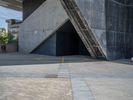 Modern architecture in Zaragoza, Spain. Two large buildings with curved metal railings stand at different heights, casting hard shadows on the open gravel area below. The straight road leads to the urban skyline in the distance.