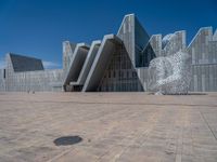 a white building with several steps and large glass panels in the facade is a mosaic that depicts a man