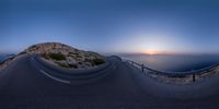 An elevated road in Mallorca, Spain, curves along the coastal landscape. The sun sets over the horizon, casting a golden glow on the clear sky. A lighthouse stands tall, guiding ships through the dark night. A scenic drive along the Balearic Islands.