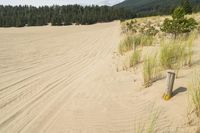 This stunning landscape photograph captures the beauty of a sand dune in the desert of Spain. The clear sky above showcases the natural color palette and rugged terrain. A road winds its way through the dune, adding a sense of adventure and exploration. The surrounding forest provides a stark contrast to the sandy surface, creating a captivating composition. This image embodies the natural wonders of Spain, with its unique landscapes and diverse ecosystems. It is a perfect representation of the beauty and serenity found in nature.