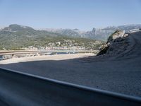 A picturesque coastal road in Mallorca, Balearic Islands, Spain. The asphalt road curves along the stunning ocean views. Clear skies and a foreground Armco barrier add to the beauty of this European nature landscape.