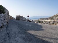 A low coastal road in Mallorca, Spain. The asphalt road winds through stunning mountainous landscape, with clear skies and the sparkling waters of the Mediterranean. Armco barriers line the road, ensuring safety along this scenic route.