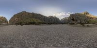 Aerial view of Majorca's coastal landscape in Spain. Gravel and dirt areas with rock walls and canyons. Clear skies create hard shadows on the open spaces. Nature meets ocean along the Balearic Islands' rocky coastline.