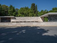 A profile view of a modern architecture museum in Barcelona, Spain. The clear sky casts hard shadows on the road, adding to the urban atmosphere. Explore the architectural wonders of Europe.