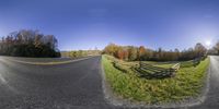 A split-open road in the USA surrounded by green grass and fences on both sides. The coastal landscape with mountains in the background adds to the scenic beauty. A perfect autumn day for a drive.