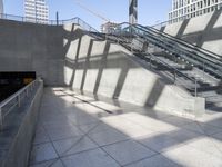 This image captures the modern architecture of Berlin, Germany. The city's urban design is characterized by sleek buildings with steel handrails and glass surfaces. The concrete flooring and metal roof create a contemporary look. The vibrant city life is reflected in the busy storefronts and subway station at Potsdamer Platz. The hard shadows and lines add depth and dimension to the scene. This photo represents the metropolitan and cosmopolitan atmosphere of Berlin, showcasing the city's unique blend of architecture, design, and urban energy.