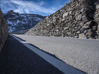 This stock photo showcases the breathtaking landscape of South Tyrol, Italy. The image captures a winding road covered with large stones, framed by towering mountains and surrounded by snow-covered trees. The road surface, made of asphalt, curves along the mountain pass, offering a stunning view of the mountain range and the glacial geology of the region. In the distance, fluffy clouds and contrails add to the picturesque atmosphere. An Armco barrier lines the side of the road, providing safety and adding to the overall infrastructure. With its low day-lighting and impressive scenery, this photo gives an overview of the Stelvio Pass, a famous tourist attraction in Europe.