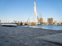 This stock photo features a stone bench that has been placed by the water. The image showcases a peaceful setting with clear sky and a boat on the horizon. The bench is located in a coastal area, adding to the serenity of the scene. The surrounding architecture highlights a modern urban design. This image captures the beauty of a cityscape during dawn in Holland, Netherlands, a city known for its stunning urban landscapes and picturesque waterfronts.