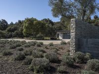 A modern stone building in the suburbs of Los Angeles, California. The exterior is surrounded by lush vegetation and a well-manicured courtyard. The clear sky showcases the rugged yet beautiful landscape of this residential property.