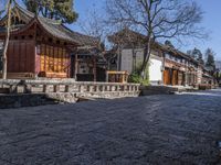 This stock photo features a stone walkway in front of a building with a few wooden benches underneath it. The image showcases the historic architecture and charm of an old village in Lijiang, China. The cobblestone road, low residential buildings, and houses add to the picturesque setting. Surrounding the stone walkway are trees, adding a touch of nature to the scene. This photo captures the essence of real estate in this old town, with its classic architecture and suburban ambiance. The clear sky above creates beautiful shadows and enhances the overall visual appeal of the photo. In the background, you can spot a shed and a shop, adding to the authenticity of the old village atmosphere. This image is perfect for any content related to travel, architecture, or real estate in Asia, particularly Yunnan province and Shangri-La region.