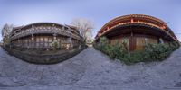 the fish eye lens image shows a stone wall and a circular building near a pond