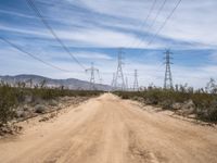 Dirt road in California's Mojave Desert, stretching straight under clear skies. Mountains in the distance create a stark contrast. A rural USA landscape featuring gravel paths, electric windmills, and sand streets.