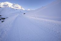 This image showcases a breathtaking winter landscape in the French Alps. The snow-covered mountain range and clear sky create a stunning backdrop for the straight road leading towards a cliff. The ski slope can be seen in the distance, attracting tourists from all over Europe. The glacial terrain and nunatak add to the beauty of this natural tourist attraction. This photo captures the essence of winter in the Alps, making it the perfect image for tourism and travel purposes.