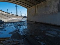 This stock photo features a straight road in California, crossing a bridge over the Los Angeles River. The road is lined with concrete walls and the clear sky above casts a hard shadow on the concrete street. The suburban neighborhood can be seen in the background, with the underpass leading to a wet water area. It is a sunny day, perfect for capturing the beauty of this urban landscape.