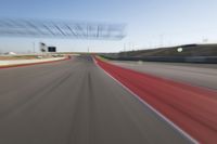 A view from above on a long straight road made of asphalt. It is a sunny day with a clear sky. The road is surrounded by structures and infrastructure. Cars are moving fast on the highway with motion blur. This road is like a race track leading to a stadium, where exciting races take place.