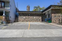 Aerial view of a straight road in a suburban neighborhood in Toronto, Canada. The road is lined with a stone wall on one side and residential buildings on the other. The asphalt surface of the road is well-maintained, with a parking lot and driveway visible in the distance. The clear sky above provides a bright backdrop for this daytime scene.