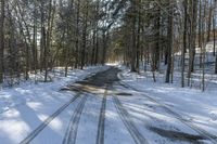 This stunning landscape photo captures a straight road in a snowy winter forest in Canada. The road surface is covered with freezing snow, leading the way through the forest. The sunlight filters through the clear sky, illuminating the trees and vegetation on both sides of the road. The branches and twigs of the trees create a beautiful natural environment. This scenic view is a perfect representation of the serene beauty of Canada's winter landscape.