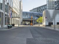 A view of a modern architecture in Berlin, Germany. The straight road leads through a bustling city, surrounded by office buildings and mixed-use neighborhoods. Clear sky adds to the vibrant city life.