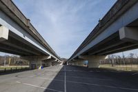 A view of a concrete bridge and asphalt road in a metropolitan area. The road surface is straight down the road. Trees line the thoroughfare, with clouds overhead. The image captures the urban atmosphere with a packshot of a parking garage in the background.
