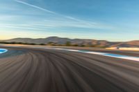 A straight, asphalt road leading into the distance. The curve of the road adds excitement, reminiscent of race tracks. Clouds in the sky suggest a dawn race. The perfect setting for fast-paced racing in the USA.