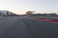 This is an image of a straight road leading to a stadium with a clear sky overhead. The asphalt highway is lined with structures and gridlines, creating a motion blur effect as an automobile races down the track. The grandstand and finish line can be seen in the distance, making it evident that this photo captures the excitement of racing. The infrastructure and lane markings highlight the organized nature of the race track. Overall, this image represents the thrill and energy of a race on a sunny day.