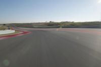 This is an image of a straight road with asphalt. The road is surrounded by a landscape with structures and clear skies. The motion blur effect indicates the movement of vehicles on the highway. This photo represents the infrastructure and mode of transport, particularly automobiles. The red stadium in the distance suggests it may be a race track. The straight road and runway-like appearance also imply a racing theme. Overall, it is a dynamic image that captures the essence of speed and motion on a clear day.