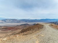 gravel road and mountains with a view of lake mead below on a cloudy day in the california foothills