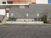 an empty parking lot in front of a gray and white building with some signs in it