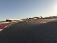 This is an image of a race track with a straight road and a curved section. The asphalt road leads straight down the track with clear skies above. The structure of the grandstand can be seen in the background, providing a view for spectators. The track is designed for high-speed racing, with clearly marked lanes and lines. This photo captures the excitement and thrill of a race, with the anticipation of cars speeding around the curve. It represents the adrenaline and passion of the racing community.