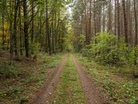 An autumn landscape in Europe, showcasing a straight gravel road lined with lush green forests. The road, made of sand and dirt, leads to the charming city of Berlin. A serene and natural scene.