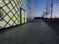 A modern architecture marvel in Berlin, Germany. The straight road leads to the famous Futurium, casting a long shadow on the sidewalk. The cityscape at dawn creates a captivating blend of light and dark.