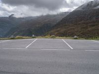 This is an image of a straight road leading through an open space in Austria, Europe. The asphalt road is surrounded by a gloomy landscape with mountains in the background. The grey sky matches the overall mood of the scene. In the foreground, there is a parking lot. The photo captures a typical day in this European country, showcasing the beauty of nature and the vast open spaces. The image is perfect for packshots or any project related to roads, landscapes, or parking.