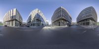 Upside down view of four modern architecture buildings in Berlin. Straight road lined with cars creates a dynamic monochrome cityscape. Sunlight casts hard shadows on the concrete and glass facades.