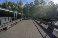 This photo depicts a sunny day in Ontario, Canada. The sunlight shines on an asphalt road near a bridge and river with metal railings. The road surface is straight and leads directly to the bridge. The surrounding vegetation creates a pleasant green landscape. The image captures the shadows and shades created by the sunlight. In the distance, the concrete streets of Toronto can be seen, adding to the urban feel of the photo. This picture showcases a public space with a combination of natural and man-made elements.