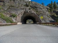 A picturesque view of a straight road in Colorado, surrounded by majestic mountains and beautiful natural landscapes. Clear skies and fluffy clouds add to the scenic beauty. The road passes through a tunnel and under a bridge, showcasing the impressive infrastructure of the area.
