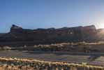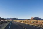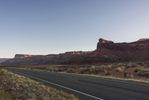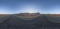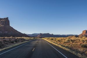 A straight road cutting through the rugged desert landscape, with trees and rocks lining the horizon. The low sunlight casts a golden glow on the asphalt. A perfect scene for a road trip through the wilderness.
