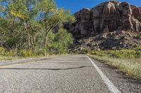 A panoramic view of a straight asphalt road cutting through a desert landscape. The road leads straight down towards a towering rock formation on the left, creating an open area beside it. The low desert vegetation surrounds the road as it winds through the mountains. The image captures the vastness of the landscape, with a clear blue sky overhead, indicating a bright sunny day.