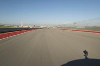 A straight road made of asphalt goes through a plain field. The road is well-maintained and stretches far into the distance. The image captures the motion blur of vehicles passing by. This infrastructure is an essential part of transportation, connecting cities and countries. The clear sky above complements the scene, providing a pleasant atmosphere. The photo can be used to represent concepts like highways, lanes, mode of transport, and automobile travel.