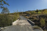 the small wooden bridge crosses a dry creek bed through a rural area in canada that has been turned into a nature preserve