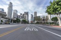 A view of the busy city of Los Angeles, California, USA. The photo captures a straight asphalt road lined with skyscrapers and surrounded by the city's vibrant skyline. The bustling metropolis showcases the urban design and city life of this iconic human settlement. The image, taken during the day, features a cloud-dotted sky and a slight motion blur, emphasizing the fast-paced atmosphere of the city. The road, part of the metropolitan area's highway system, is filled with constant traffic and serves as a major thoroughfare for urban transport. A captivating cityscape in downtown Los Angeles.
