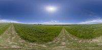 A straight road through a lush green field in rural Germany. The clear sky and open space create a serene landscape. A wind turbine stands tall as a modern sculpture in the distance.